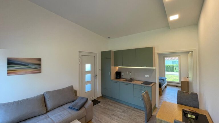 • 1 Wohnzimmer im EG mit Schlafsofa, SAT-TV, LAN/WLAN, Küchenzeile mit 125 Liter Kühlschrank und Gefrierfach, 2-Platten Induktionsfeld, Geschirrspülmaschine usw.